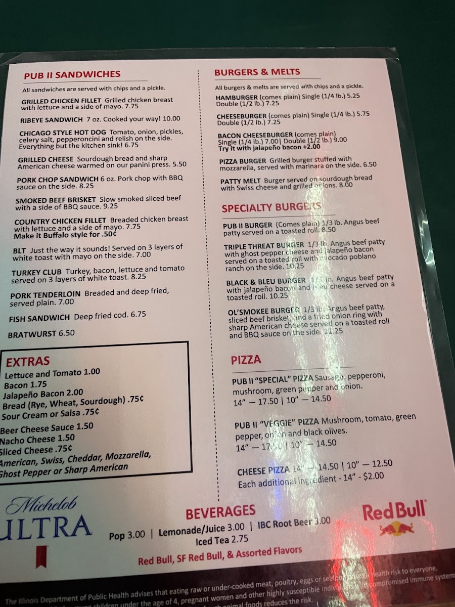 Welcome to Pub II, located at 102 N Linden St, Normal, IL. This local gem is renowned for its vibrant atmosphere and a diverse menu that caters to a variety of tastes. Start your culinary journey with tempting appetizers like the mouthwatering Fried Cheese Balls or Buffalo Fries, perfect for sharing. For pizza lovers, indulge in the Pub II "Special" Pizza or the refreshing Veggie option. Don’t miss their burgers, ranging from the classic Cheeseburger to the unique Pizza Burger, ensuring there's something for everyone.